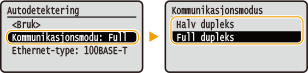 2 | <Kommunikasjonsmodus> velg kommunikasjonsmodusen.![]() <Halv dupleks> Sender og mottar kommunikasjonsdata etter tur. Velg denne når maskinen er koblet til en nettverksenhet som bruker halv dupleks. <Full dupleks> Sender og mottar kommunikasjonsdata samtidig. Bruk denne innstillingen for de fleste miljøer. |