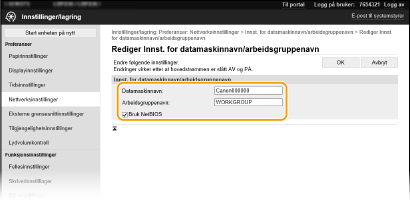 Navnet på arbeidsgruppen er et navn for å gruppere flere datamaskiner slik at grunnleggende nettverkfunksjoner, for eksempel fildeling, blir tilgjengelige på et Windows-nettverk. Skriv inn alfanumeriske tegn for navnet på den arbeidsgruppen som maskinen tilhører.