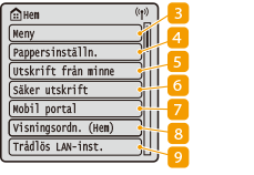 ![]() | <Meny><Funktionsinställn.>, <Preferenser> och många andra inställningar för enheten startas med den här knappen. Inställningsmenylista <Pappersinställn.>Den här knappen används för att ange format och typ för papperet som är påfyllt i papperslådan och i facket för manuell matning. Ange pappersformat och -typ <Utskrift från minne>Skriver ut filer som har sparats på ett USB-minne. Skriva ut från ett USB-minne (minnesenhetsutskrift) <Säker utskrift>Använd den här funktionen för att skriva ut ett säkert dokument. Skriva ut ett dokument som kräver en PIN-kod (säker utskrift) <Mobil portal>Använd denna knapp för att upprätta en anslutning till en mobil enhet. Ansluta till mobila enheter <Visningsordn. (Hem)>Här kan du ändra i vilken ordning som Hem-skärmknapparna visas. Anpassa skärmen Hem <Trådlös LAN-inst.>Använd den här knappen för att ange inställningar för trådlöst LAN. Ansluta till ett trådlöst nätverk |