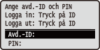 Om Hantering av avdelnings-ID eller Systemansvarig-ID är aktiverat måste du logga in innan du använder enheten. När inloggningsskärmen visas gör du på följande sätt för att ange avdelnings-ID och PIN-koden.
