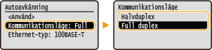 2 | <Kommunikationsläge> för att välja kommunikationsläge.![]() <Halvduplex> Sänder och tar emot kommunikationsdata alternerande. Välj det här alternativet om enheten är ansluten till en nätverksenhet med halv duplex. <Full duplex> Sänder och tar emot kommunikationsdata samtidigt. Använd den här inställningen för de flesta miljöer. |