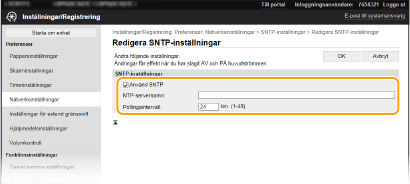 Enhetens SNTP har stöd både för NTP- (version 3) och SNTP-servern (version 3 och 4). Mer information om grundläggande åtgärder som ska utföras för att konfigurera enheten från fjärranvändargränssnittet finns i Ställa in menyalternativ från Fjärranvändargränssnittet. |