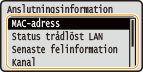IP-adressen har inte angetts på rätt sätt om den visas som "0.0.0.0". Om du ansluter enheten till ett växlingsnav eller en brygga kan detta resultera i anslutningsfel även om IP-adressen är korrekt inställd. Du löser problemet genom att lägga in ett visst intervall innan enheten ska börja kommunicera. Ange väntetid innan enheten ansluts till ett nätverk Du kan skriva ut en lista över aktuella nätverksinställningar. Användarens datalista/systemansvarigs datalista |