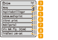 ![]() | <Menu><Funktionsindstillinger>, <Præferencer> og mange andre maskinindstillinger starter med denne knap. Liste over menuen Indstilling <Papirindstillinger>Denne knap bruges til at angive størrelsen og typen af papir, der er lagt i papirskuffen og den manuelle fremføringsåbning. Angivelse af papirformat og –type <Hukom.medieprint>Udskriver filer gemt på en USB-hukommelsesenhed. Udskrivning fra USB-hukommelse (hukommelsesmedieudskrivning) <Sikret print>Brug denne funktion til at udskrive et sikkert dokument. Udskr. et dok. sikret med en PIN-kode (sikret print) <Mobilportal>Brug denne til at etablere en forbindelse til en mobil enhed. Forbindelse til mobilenheder <Vis Ræk.flg. (Hjem)>Gør det muligt at ændre den rækkefølge, som Hjem-skærmknapperne vises i. Tilpasning af Hjem-skærmen <Trådløst LAN-sæt>Brug denne knap til at konfigurere indstillingerne for trådløst LAN. Oprettelse af forbindelse til trådløst LAN |
