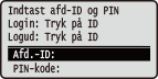 Hvis administration af afdelings-id'er er aktiveret, eller systemadministrator-id'er er aktiveret, skal du logge på, inden du bruger maskinen. Når loginskærmen vises, skal du bruge proceduren herunder for at indtaste Afdelings-id'et og pinkoden.