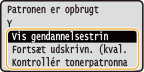 Når der vises en meddelelse Når du udskriver, kan du fortsætte med at udskrive originalen. Hvis der vises en meddelelse for den sorte tonerpatron, mens der modtages en I-fax, vil maskinen ikke udføre udskrivningen, så der kan undgås en uklar udskrift. For at fortsætte med udskrivningen, også selv om den resterende mængde i tonerpatronen er lav, skal du indstille <Fortsæt print, når patron er lav> til <Til>. <Fortsæt print, når patron er lav>Angiv, når en meddelelse vises |