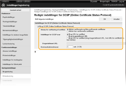 Du kan få bekræftet, om det certifikat, du har modtaget fra den anden part under kommunikationen, er gyldig ved at sende en forespørgsel til OCSP (online-certifikatstatusprotokol ). Konfigurér niveauet for verificering af certifikat og den OCSP-respondent, der skal oprettes forbindelse til. Disse skal registreres af administratoren.