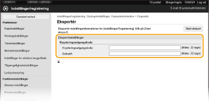 Indtast en adgangskode for at kryptere eksportdata ved hjælp af alfanumeriske tegn. Indtast den samme adgangskode i [Bekræft]. Du skal indstille en krypteringsadgangskode for at eksportere dataene.