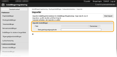 Indlæs (importer) data, der er blevet eksporteret fra maskinen. Du kan også importere maskinindstillingsdata fra en anden maskine til din maskine, hvis modellerne er den samme.