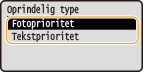 <Oprindelig type> Du kan vælge originaltypen afhængigt af det billede, der skal udskrives. <Fotoprioritet> Giver prioritet til udskrivning af fotobilleder på en jævn måde. <Tekstprioritet> Giver prioritet til udskrivning af tydelig tekst. |