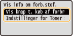 Hvis du ikke vil bruge Toner Status, skal du vælge <Fra>. Hvis du vil forhindre, at der vises en knap, som giver adgang til websteder, hvor man kan købe tonerpatroner, i Toner Status, skal du vælge <Til> og derefter <Fra>.