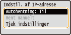 Manuel angivelse af en IP-adresse1 | Konfigurer en indstilling til at deaktivere automatisk hentning Vælg <Autohentning>, og indstil både <Vælg protokol> og <Auto-IP> til <Fra>. |