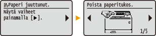Joissakin tapauksissa, kun tapahtuu virhe, näytetään ohjeet virheen korjaamiseksi. Ratkaise ongelma noudattamalla näyttöön tulevia ohjeita. Alla näytetään esimerkkinä näyttö, joka tulee esiin, kun tapahtuu paperitukos.