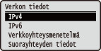Näyttää verkkoasetukset, kuten laitteen IP-osoitteen, sekä tilan, kuten langattoman tiedonsiirron tilan.