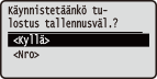 Jos <Näyttö, kun tallennusväline on liitetty> -asetukseksi on valittu <Kyllä> ja USB-muistilaite asetetaan, esiin tulee näyttö muistivälinetulostuksen aloittamisesta Koti-näytön ollessa näkyvissä. <Näyttö, kun tallennusväline on liitetty> ![]() Koska näyttöjä ei välttämättä näytetä lepotilassa, poistu lepotilasta ennen USB-muistilaitteen asettamista. |