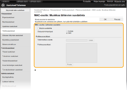 2 | Määritä poikkeusosoitteet. Syötä MAC-osoite [Tallennettava osoite] -kenttään ja napsauta [Lisää]. Osoitetta ei tarvitse erotella tavuviivoilla tai kaksoispisteillä. ![]() Tarkista, ettei syötössä ole tapahtunut virheitä Jos MAC-osoitteet on syötetty väärin, et ehkä pysty käyttämään laitetta etäkäyttöliittymästä, missä tapauksessa <MAC-osoitesuodatin>-asetukseksi täytyy valita <Ei>. <MAC-osoitesuodatin> ![]() Kun lähtevien suodattimeksi on valittu [Hylkää] Lähteviä monilähetys- ja sarjalähetyspaketteja ei voi suodattaa. MAC-osoitteen poistaminen poikkeuksista Valitse MAC-osoite ja napsauta [Poista]. ![]() | ||||