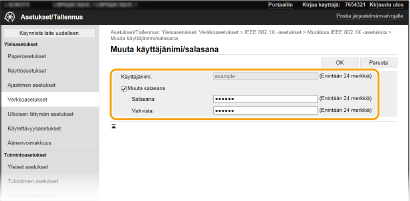3 | Aseta käyttäjänimi/salasana. [Käyttäjänimi] Syötä käyttäjänimi käyttämällä aakkosnumeerisia merkkejä. [Muuta salasana] Aseta tai muuta salasana valitsemalla tämä valintaruutu ja syöttämällä uusi salasana käyttämällä aakkosnumeerisia merkkejä [Salasana]- ja [Vahvista]-tekstiruutuihin. |