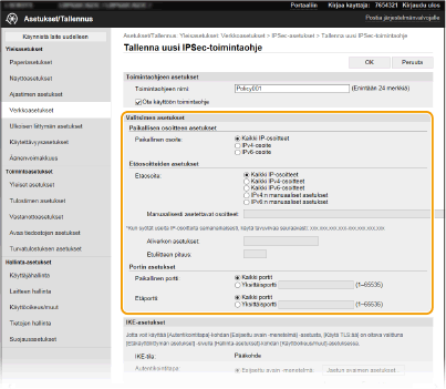 [IPv4-osoite] | Valitse, kun IPSec-protokollaa käytetään kaikkiin IP-paketteihin, jotka lähetetään tai vastaanotetaan laitteen IPv4-osoitteesta. |