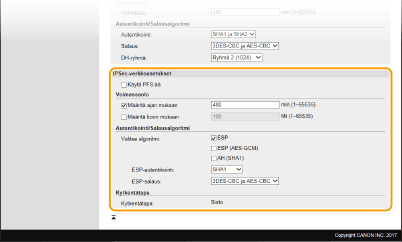 Valitse [ESP]-, [ESP (AES-GCM)]- tai [AH (SHA1)] -valintaruutu/-ruudut IPSec-otsikon ja käytetyn algoritmin mukaan. AES-GCM on algoritmi, jota käytetään sekä todennukseen että salaukseen. Jos [ESP] on valittu, valitse myös algoritmit todennusta ja salausta varten avattavista luetteloista [ESP-autentikointi] ja [ESP-salaus].