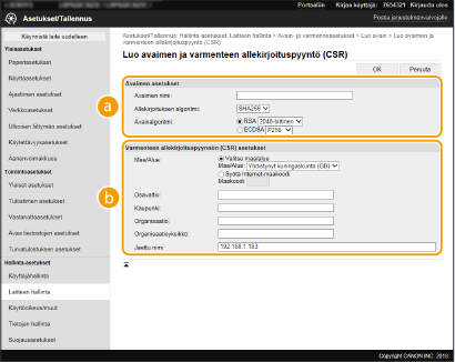 Koska laitteella luoduilla varmenteilla ei ole CA-allekirjoitusta, seurauksena voi olla tiedonsiirtovirhe laitteiden, joiden kanssa se siirtää tietoja, mukaan. Jotta varmenteen myöntäjä voisi myöntää CA-allekirjoituksen sisältävän varmenteen, sinun täytyy hankkia varmenteen allekirjoituspyynnön (CSR) tiedot, jotka pääkäyttäjä voi luoda etäkäyttöliittymästä. Kun varmenne myönnetään, tallenna se avaimeen luodun CSR:n kanssa.