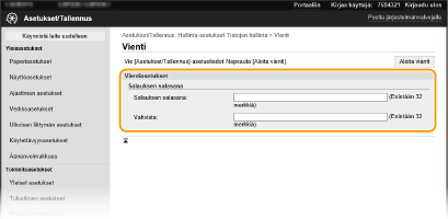 Syötä vientitietojen salauksen salasana aakkosnumeerisilla merkeillä. Syötä sama salasana kohdassa [Vahvista]. Salauksen salasana on asetettava tietojen vientiä varten.