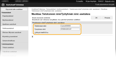 Työryhmän nimi on nimi, jota käytetään useiden tietokoneiden ryhmittelyyn niin, että perusverkkotoiminnot, kuten tiedostojen jakaminen, ovat käytettävissä Windows-verkossa. Syötä aakkosnumeerisilla merkeillä sen työryhmän nimi, johon laite kuuluu.