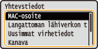 IP-osoitetta ei ole määritetty oikein, jos se näytetään muodossa "0.0.0.0". Kun laite kytketään keskittimeen tai siltaan, yhteyden muodostus saattaa epäonnistua, vaikka IP-osoite on määritetty oikein. Tämän ongelman voi ratkaista asettamalla ajan, jonka laite odottaa ennen tiedonsiirron aloittamista. Verkkoon yhdistämisen odotusajan asettaminen Voit tarvittaessa tulostaa nykyisten verkkoasetusten luettelon. Käyttäjän tietolista/Järjestelmänvalvojan tietolista |