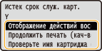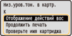 Если отображается сообщение При печати можно продолжить печатать оригинал. Если это сообщение появилось для картриджа с черным тонером, когда аппарат принимает интернет-факс, аппарат не выполняет печать во избежание нечеткой печати. Чтобы продолжить печать несмотря на заканчивающийся тонер, задайте для параметра <Прод. печать, если в картр. мало тонера> значение <Включить>. <Прод. печать, если в картр. мало тонера>Укажите, когда должно отображаться сообщение |