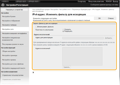 При неправильном вводе IP-адресов доступ к аппарату из Удаленного ИП может быть невозможен. В этом случае необходимо установить для <Фильтр IPv4-адресов> или <Фильтр IPv6-адресов> значение <Выкл.>.