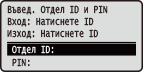 Ако сте разрешили управление чрез кодове на отдели или ID на системни оператори, трябва да влезете, преди да използвате устройството. Когато екранът за влизане се покаже, използвайте процедурата по-долу, за да въведете код на отдел и PIN код.