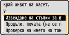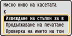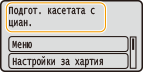 Кога да се показва съобщение При печат – можете да продължите да отпечатвате документа. Ако се изведе съобщение за касетата с черния тонер, докато получавате I-факс, устройството няма да изпълни отпечатването, за да се избегнат неясните разпечатки. За да продължите да печатате дори когато в касетата остава малко количество тонер, задайте настройката <Прод. печат. Когато кол. в кас. е малко> на <Вкл.>. <Прод. печат. Когато кол. в кас. е малко>Посочете кога да се показва съобщение |