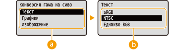 <Текст> <sRGB> <NTSC>  <Еднакво RGB> <Графики> <sRGB> <NTSC>  <Еднакво RGB> <Изображение> <sRGB> <NTSC>  <Еднакво RGB> |