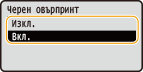 Изберете дали принтерът да превключва между печат върху хартия с формат A4 и Letter, ако единият от тези формати хартия е зареден, а другият – не. Когато за тази настройка сте избрали <Вкл.>, ако от компютъра зададете печат върху хартия с формат A4, но в устройството няма заредена хартия с формат A4, устройството ще отпечата документа във формат Letter.