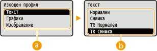 От тази настройка можете да конфигурирате устройството да използва само тонера K (черно) за печат на черен текст, за който цветовата информация е кодирана по модела "R = G = B = 0%", "C = M = Y = 100%" или "C = M = Y = 0%/K = 100%". Ако тази настройка е зададена на <Изкл.>, текстът ще се печата в съответствие със зададената в <Изходен профил> настройка.