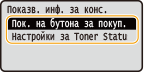 <Пок. на бутона за покуп. на конс. (ОПИ)> <Изкл.> <Вкл.>  <Настройки за Toner Status> <Изкл.> <Вкл.>  <Пок. на бутон за покуп. конс.> <Изкл.> <Вкл.>  |