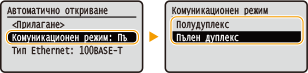 2 | <Комуникационен режим> Изберете комуникационния режим.![]() <Полудуплекс> Редува изпращане и получаване на комуникационни данни. Изберете тази настройка, когато устройството е свързано към мрежово устройство чрез полудуплекс. <Пълен дуплекс> Едновременно изпраща и получава комуникационни данни. Тази настройка е подходяща за повечето работни среди. |