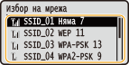 Можете да извършите търсене за безжични маршрутизатори (или точки за достъп), които са достъпни за свързване, и да изберете един от дисплея на устройството. За мрежов ключ въведете WEP ключ или PSK. Преди да изберете безжичен маршрутизатор, намерете и си запишете нужната информация за настройката, включително SSID и мрежовия ключ (