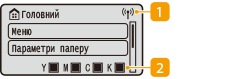 на панелі керування. Цей екран призначено для вибору параметрів і реєстрації функцій.![]() | Піктограма Wi-FiВідображається, коли апарат підключено до бездротової локальної мережі. Залишок тонера в картриджахВідображає інформацію про залишок тонера в картриджах у декілька етапів. Це значення приховується, доки активний головний екран. |