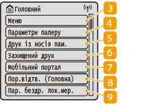 ![]() | <Меню>Спочатку потрібно натиснути цю кнопку, щоб перейти до параметрів <Параметри функції>, <Настройки> тощо. Список меню параметрів <Параметри паперу>За допомогою цієї кнопки можна вказати формат і тип паперу, який завантажується в шухляду для паперу та пристрій ручного подавання. Установлення формату та типу паперу <Друк із носія пам.>Друкує файли, які зберігаються на пристрої USB-пам’яті. Друк із пристрою USB-пам’яті (друк із носія пам’яті) <Захищений друк>Використовуйте цю функцію, щоб надрукувати захищений документ. Друк документа, захищеного PIN-кодом (безпечний друк) <Мобільний портал>Використовуйте цей елемент, щоб установити підключення до мобільного пристрою. Установлення зв’язку з мобільними пристроями <Пор.відтв. (Головна)>Дає змогу змінити порядок розташування кнопок на екрані Головний Налаштування екрана Головний <Пар. бездр. лок.мер.>Налаштуйте параметри безпровідної локальної мережі за допомогою цієї кнопки. Підключення до бездротової локальної мережі |