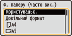 Якщо необхідно часто змінювати папір для завантаження, виберіть параметр <Довільний формат>; це зменшить кількість кроків, які необхідно виконати під час кожної зміни. Якщо встановлений у драйвері принтера параметр дуже відрізняється від формату паперу, що завантажується, можна відображати повідомлення про помилку.