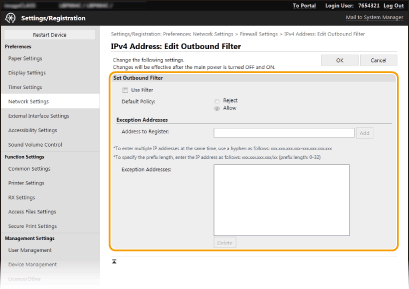 Якщо вибрано елемент [Reject] для вихідного фільтра Вихідні пакети багатопотокового й широкомовного передавання неможливо відфільтрувати. Видалення IP-адреси з винятків Виберіть IP-адресу й натисніть кнопку [Delete]. ![]() | ||||||||||||||