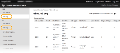 Відображаються журнали завдань друку та отримання (RX).