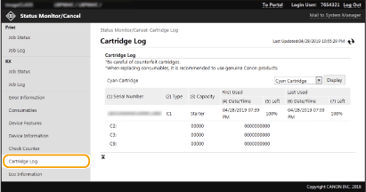 Можна перевірити журнали використання картриджів із тонером та інші журнали. Дані можна відображати окремо для кожного кольору тонера в картриджі.