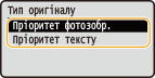 <Тип оригіналу> Ви можете вибрати тип оригіналу залежно від зображення, що друкується. <Пріоритет фотозобр.> Пріоритет надається друку фотографій зі згладжуванням. <Пріоритет тексту> Пріоритет надається чіткому друку тексту. |
