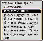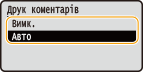 <Друк коментарів> Цей параметр визначає, чи потрібно друкувати примітки у файлі PDF. <Вимк.> Примітки не друкуються. <Авто> Друкуються лише примітки, вибрані для друку у файлі PDF. |