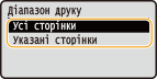 <Діапазон друку> Укажіть сторінки, які потрібно надрукувати. <Усі сторінки> Друкуються всі сторінки. <Указані сторінки> Укажіть діапазон сторінок, які потрібно надрукувати. За допомогою цифрових клавіш введіть потрібне значення в кожне поле <Перша сторінка> і <Остання сторінка>, а потім виберіть команду <Застосувати>. Якщо вказаний діапазон сторінок не відповідає жодній сторінці файлу у форматі PDF, друк не виконується. |