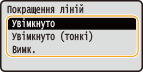 <Покращення ліній> Укажіть, чи використовувати обробку, яка стандартизує товщину тонких ліній. <Увімкнуто> Стандартизує товщину тонких ліній. <Увімкнуто (тонкі)> Стандартизує та зменшує товщину тонких ліній. Лінії можуть стати надто тонкими та/або нечіткими. <Вимк.> Не стандартизує товщину тонких ліній. Тонкі лінії можуть бути товщими або нерівномірними: це залежить від положення малювання та кута лінії. |