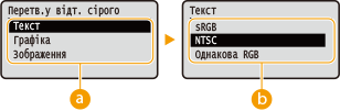 <Текст> <sRGB> <NTSC>  <Однакова RGB> <Графіка> <sRGB> <NTSC>  <Однакова RGB> <Зображення> <sRGB> <NTSC>  <Однакова RGB> |