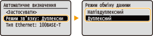 2 | <Режим обміну даними> Виберіть режим зв’язку.![]() <Напівдуплексний> Почергово передає й отримує дані зв’язку. Виберіть, коли апарат підключатиметься до мережевого пристрою, використовуючи напівдуплексний режим. <Дуплексний> Одночасно передає й отримує дані зв’язку. Використовуйте цей параметр у більшості середовищ. |
