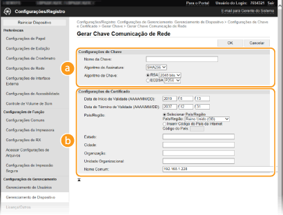 Se selecionar [SHA384] ou [SHA512] em [Algoritmo de Assinatura], não é possível selecionar [512 bits] como comprimento da chave quando seleciona [RSA] em [Algoritmo de Chave].